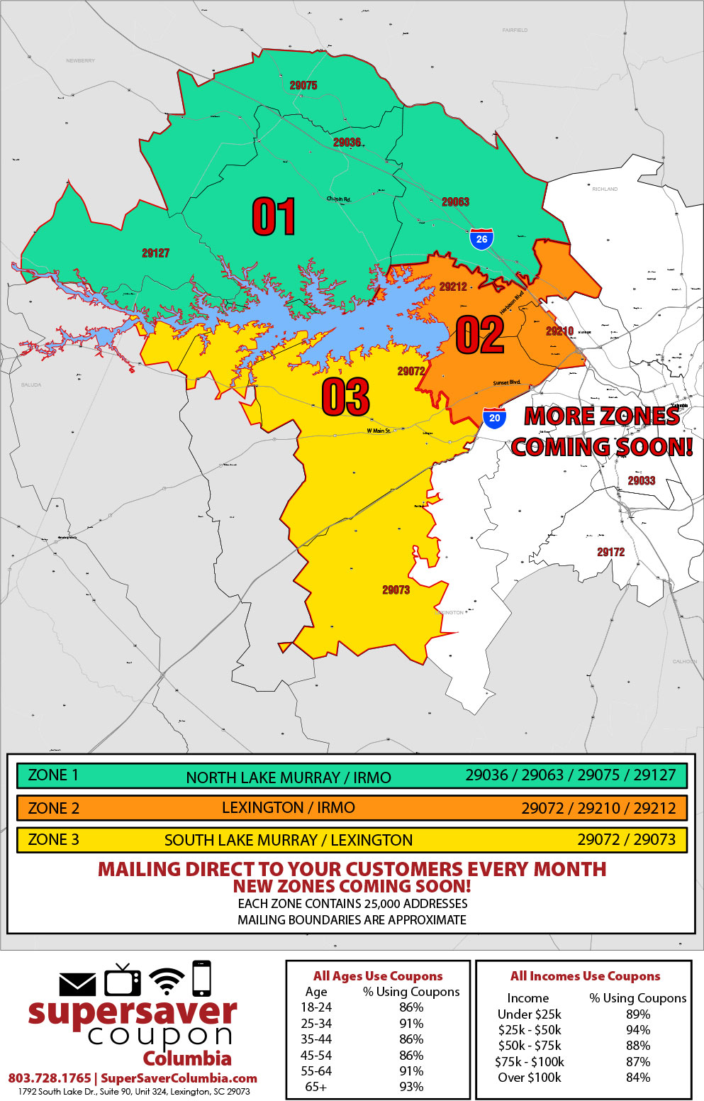 We prouldy deliver coupons to residences across Columbia, Lexington, and Irmo every month! Our valuable coupons can save you hundreds, and they're all FREE! For more information on how to receive our coupons or if you're interested in mailing coupons out for your business or organization, hop over to our contact page to learn more about mailing coupons in Columbia, Lexington, and Irmo.